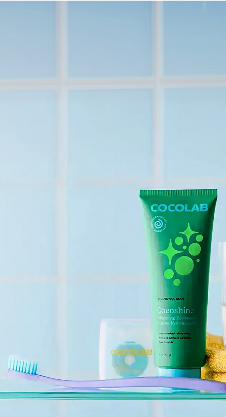 Cococare toothbrush, toothpaste, and dental floss on a blue background Cocolab toothpaste, toothbrushes, and a towel on a glass shelf with a blue background