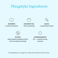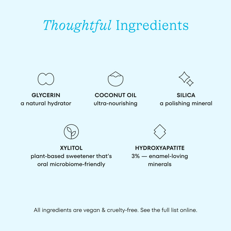 DELIGHTFUL MINT: water (you know, H₂O), glycerin (natural hydrator), silica (naturally-derived mineral that gently polishes), xylitol* (plant-based sweetener that’s microbiome-friendly), hydroxyapatite (3% — mineral that strengthens, whitens, and reverses sensitivity), cellulose gum (plant-based thickener), cocos nucifera (coconut) oil (microbiome-friendly), natural flavor (spearmint oil, cornmint oil, anise, camphor, and menthol for breath freshening), aloe barbadensis leaf juice* (naturally soothing), sodium bicarbonate (baking soda, a natural surface stain remover), sodium citrate (salt derivative that reduces sensitivity), potassium chloride (natural mineral salt that reduces sensitivity), stevia rebaudiana extract (natural sugar-free sweetener), sodium lauroyl sarcosinate (naturally-derived cleanser).